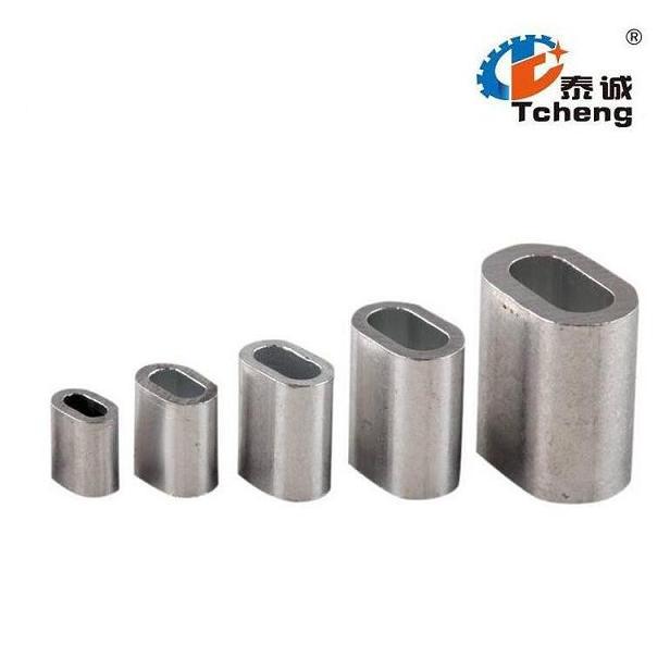 鋼絲繩鋁套—鋁套是鋁材質(zhì)的,較輕,用來固定鋼絲繩兩端的頭的,鋼絲繩根據(jù)需要的掛圈大小,插入鋁套,然后放入壓套機(jī)模具內(nèi),(根據(jù)鋁套型號(hào)對(duì)應(yīng)壓套機(jī)模具,模具型號(hào)跟鋁套型號(hào)都是標(biāo)準(zhǔn)尺寸),壓制完,把兩邊擠壓出來的鋁廢料清理掉,一根鋼絲繩完成!